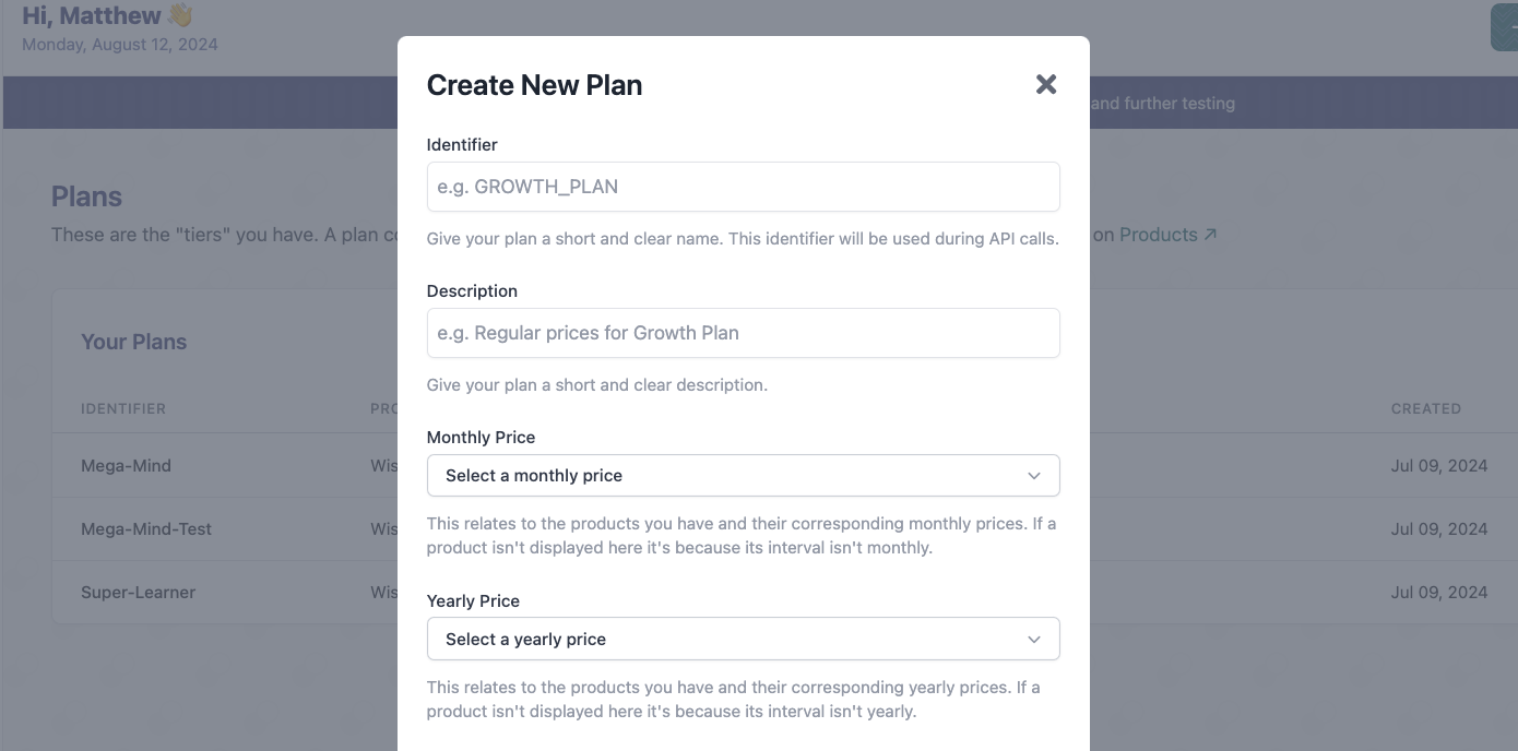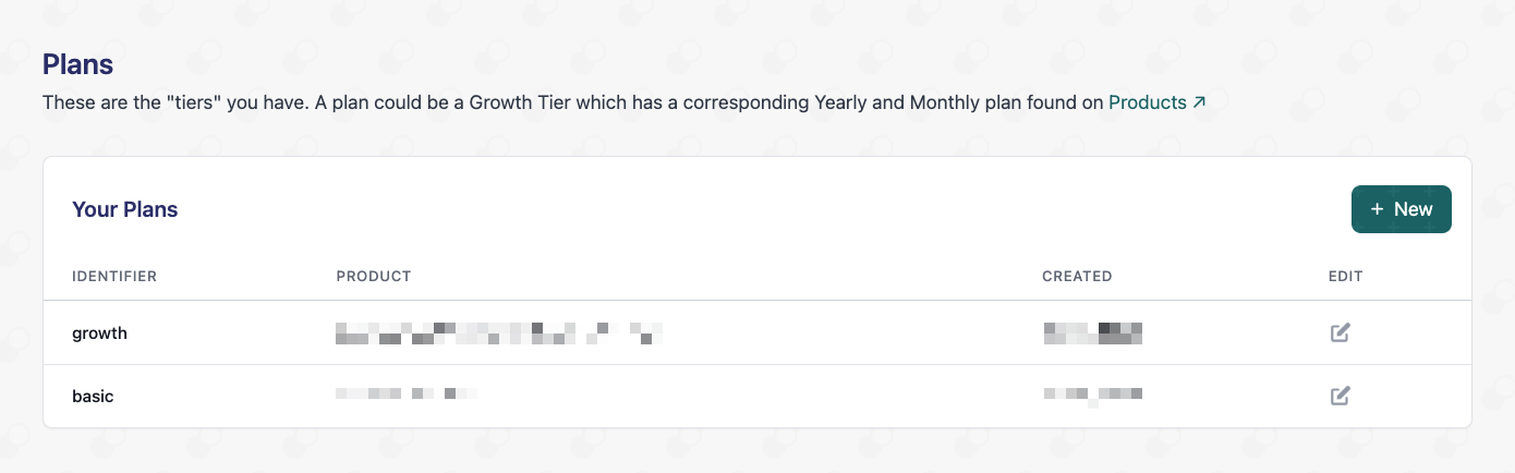After you’ve imported your products from Stripe, you need to have a 1-to-1 mapping of the Product to their interval types. For instance, you can create a new plan called ‘Growth Tier’ where you link one Product for the monthly interval, and another Product for the yearly interval.